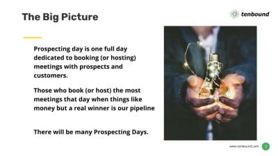 Again, those are sample slides to use in an All Hands call or team meeting. A clear, simple slide deck paints a bright picture for your stakeholders of what Prospecting Day is all about. It also helps you articulate “the why and the how” to the business.