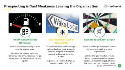 Three areas are called out here because “3” is the magic number and is easy to remember. This slide throws a left jab by mentioning the business has insufficient pipeline coverage, followed by some specifics, for context.