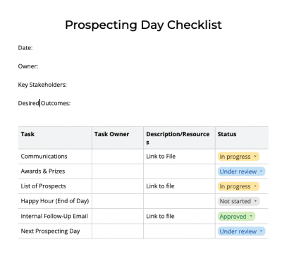 Start writing the follow-up email now – the one you’ll send the day after Prospecting Day – and save it as a draft. Writing it will get the wheels turning on what outcomes to drive, who to involve, what awards to consider, and where the team must focus.