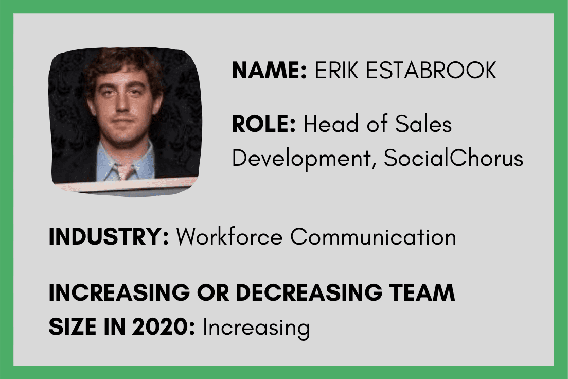 Erik wants the SocialChorus team to be known for being the hardest working and most knowledgeable team, while also having the most fun. Looking back on their success in 2019, he believes they have a fantastic opportunity to help the people on the team take that next step in their career and go on to more significant revenue-driving roles, whether that’s as an account executive, in customer success, or management. By the end of 2020, Erik hopes that many team members will have moved on and are successful in their next role.
