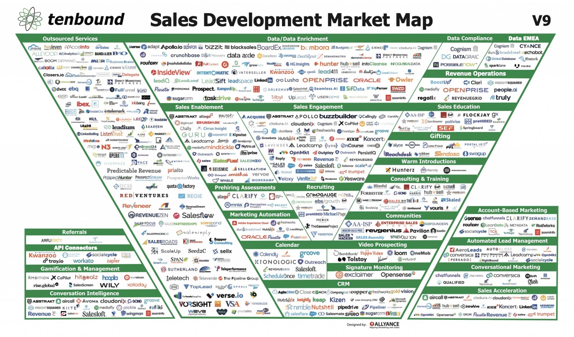 Making sense of the Sales Technology landscape is becoming more complex all the time. Here at Tenbound Research Labs, we’ve worked hard to organize the different sectors specific to the Sales Technology landscape into this map.