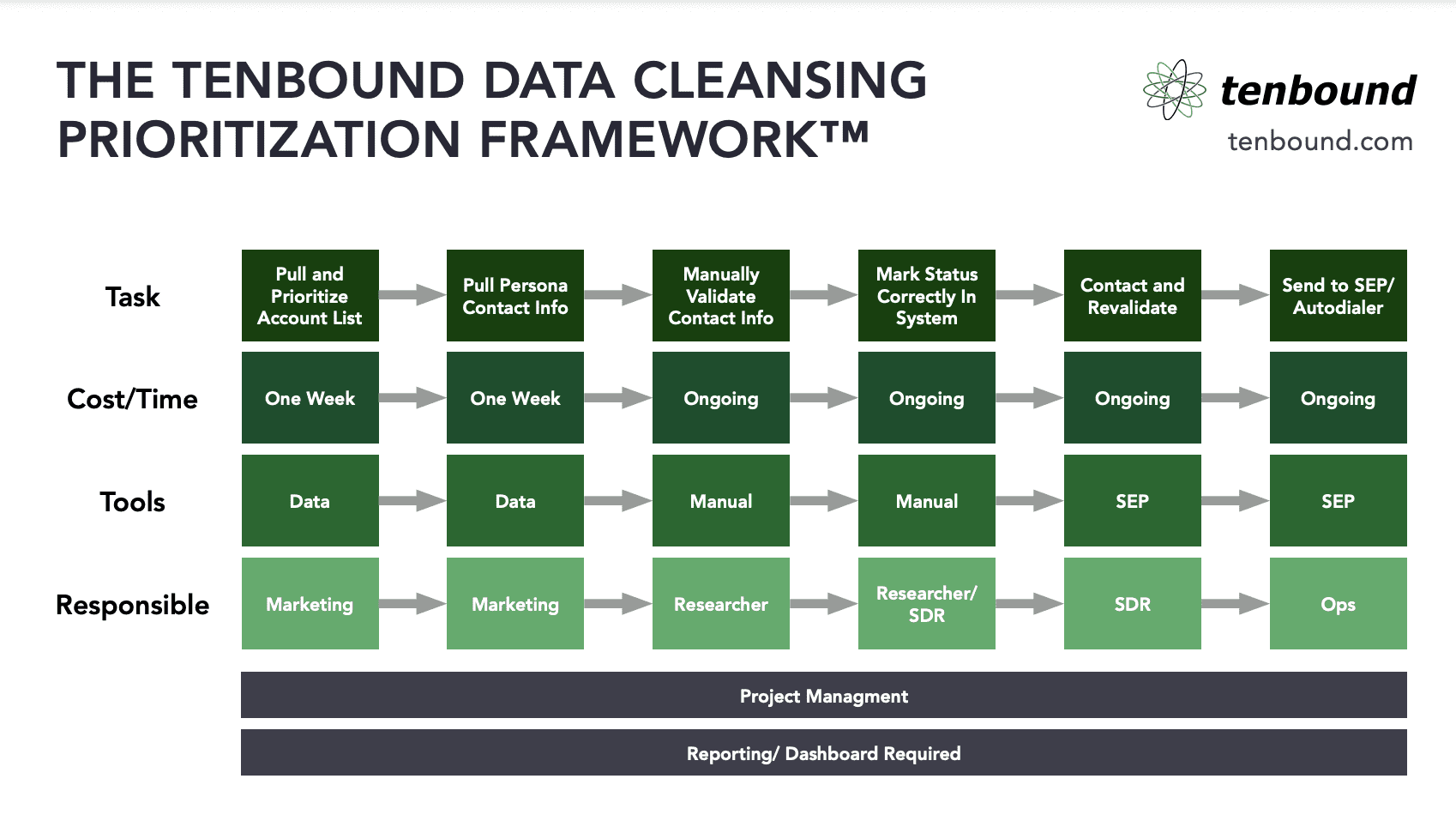 Having reliable data is essential for SDRs. Following Tenbound’s Data Cleansing Prioritization Framework™ ensures the right people carry out the right tasks with the right tools. This means that the data you’re using is clean and prioritized, leading to better results and more sales.
