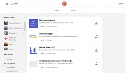 - Visit Product Hunt and search for competing or complementary products to yours (in this example we are going to target remote workers/people interested in remote work) https://share.getcloudapp.com/8LuwYB6Q