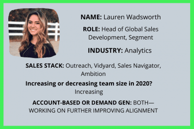 Lauren has two objectives for 2020. First of all, she wants her Sales Development team to be best-in-class, empowered and enabled to truly personalize their outreach. When a prospect receives outreach from their SDRs, Lauren wants it to be of the best pieces of outreach they’ve ever seen.